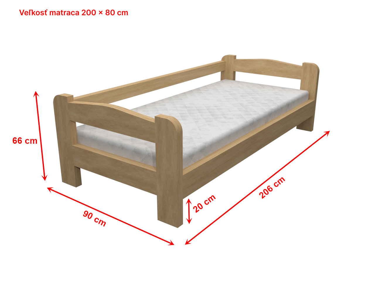 Posteľ vrátane roštu. Pohodlná drevená posteľ z masívu pre vašu relaxáciu a oddych. Posteľ má pevnú konštrukciu z poctivého smrekového prírodného dreva. Matrac za príplatok. Je možné objednať v rozmere 200 x 80 cm alebo 200 x 90 cm.