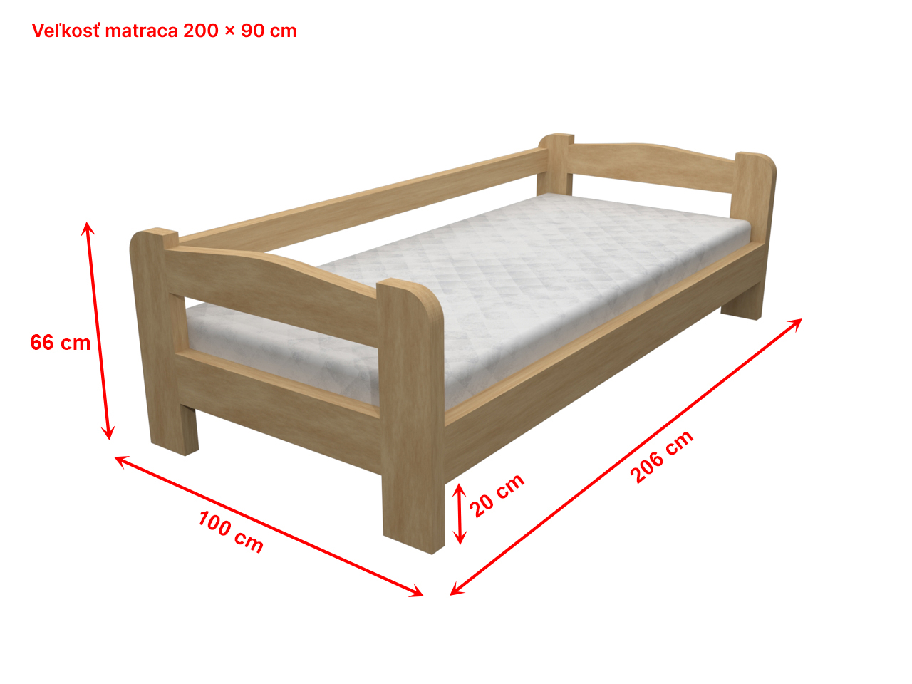 Posteľ vrátane roštu. Pohodlná drevená posteľ z masívu pre vašu relaxáciu a oddych. Posteľ má pevnú konštrukciu z poctivého smrekového prírodného dreva. Matrac za príplatok. Rozmer 200 x 90 cm.