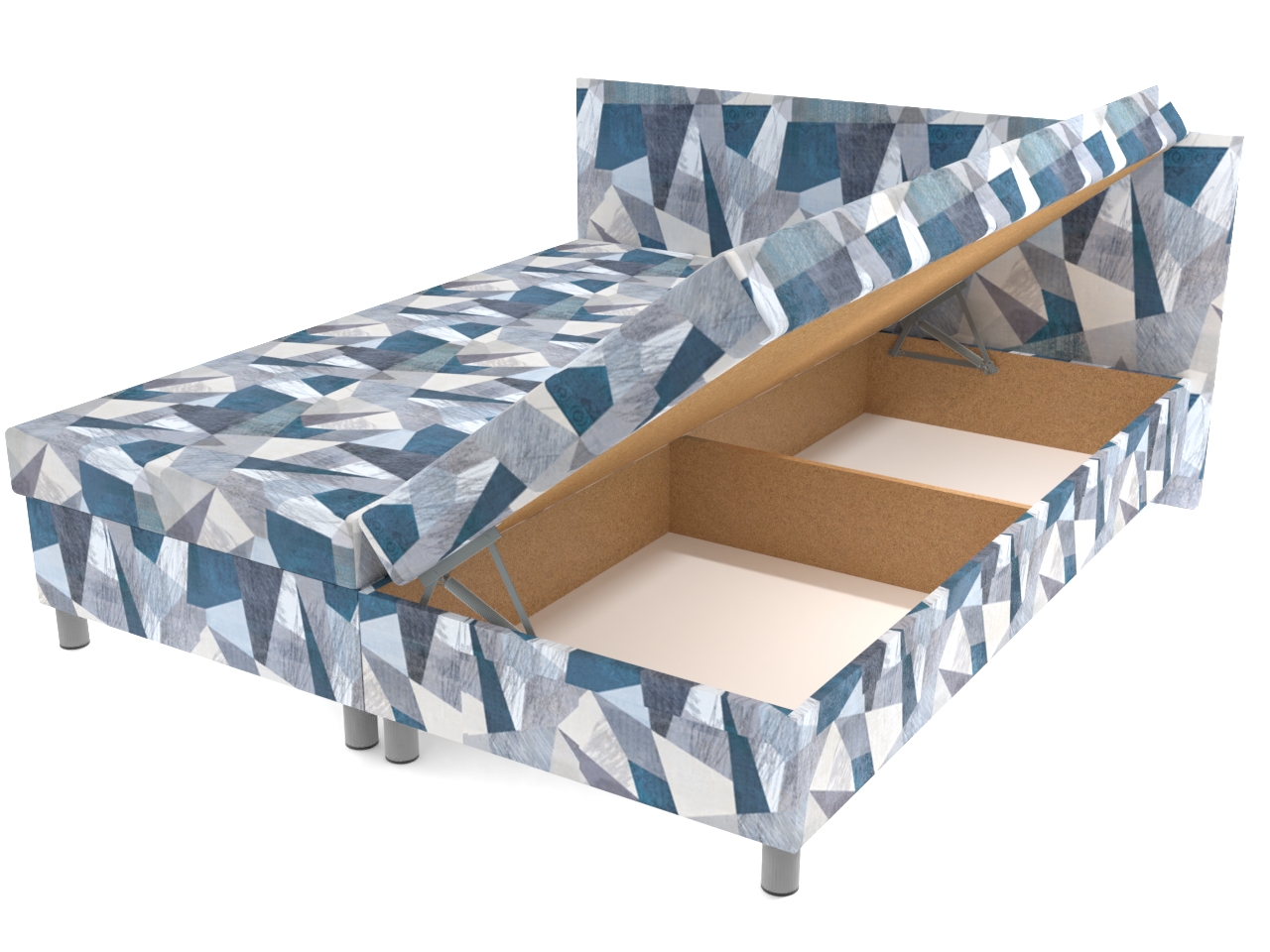 Pohodlná celočalúnená dvojposteľ na nohách pre Vašu relaxáciu a odpočinok. Dvojposteľ má pevnú konštrukciu z drevotrieskových dosiek. Okrem pohodlného ležania ponúka aj bohatý úložný priestor, otvárajúci sa kvalitným pružinovým mechanizmom, do ktorého umiestnite periny, vankúše a ďalšie veci.