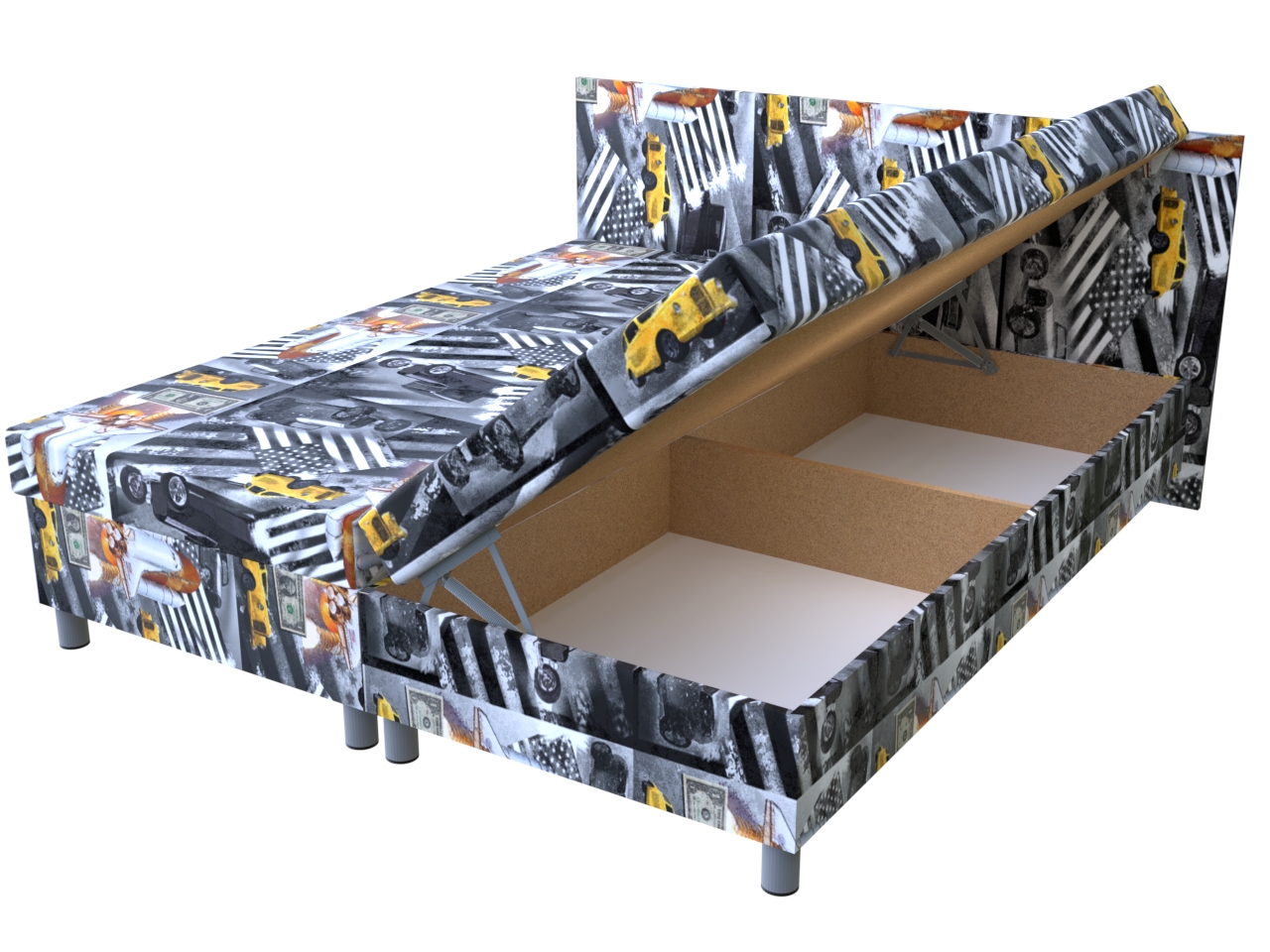 Pohodlná celočalúnená dvojposteľ na nohách pre Vašu relaxáciu a odpočinok. Dvojposteľ má pevnú konštrukciu z drevotrieskových dosiek. Okrem pohodlného ležania ponúka aj bohatý úložný priestor, otvárajúci sa kvalitným pružinovým mechanizmom, do ktorého umiestnite periny, vankúše a ďalšie veci.