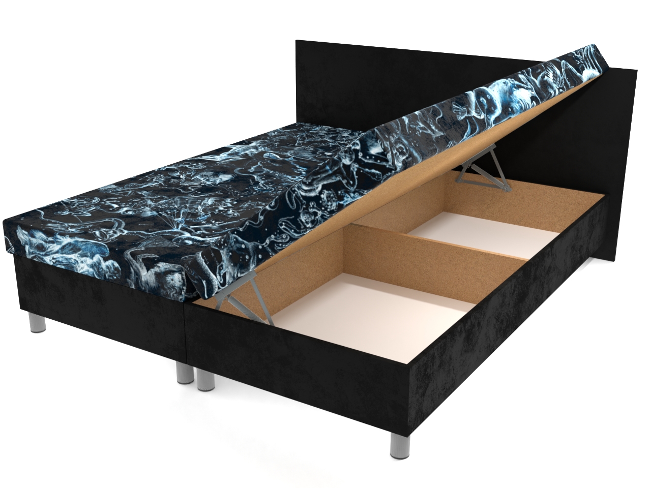 Pohodlná celočalúnená dvojposteľ na nohách pre Vašu relaxáciu a odpočinok. Dvojposteľ má pevnú konštrukciu z drevotrieskových dosiek. Okrem pohodlného ležania ponúka aj bohatý úložný priestor, otvárajúci sa kvalitným pružinovým mechanizmom, do ktorého umiestnite periny, vankúše a ďalšie veci.