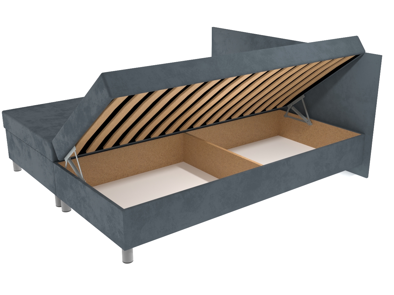 Pohodlná celočalúnená lamelová dvojposteľ na nohách pre Vašu relaxáciu a odpočinok. Dvojposteľ má pevnú konštrukciu z drevotrieskových dosiek. Okrem pohodlného ležania ponúka aj bohatý úložný priestor, otvárajúci sa kvalitným pružinovým mechanizmom, do ktorého umiestnite periny, vankúše a ďalšie veci.