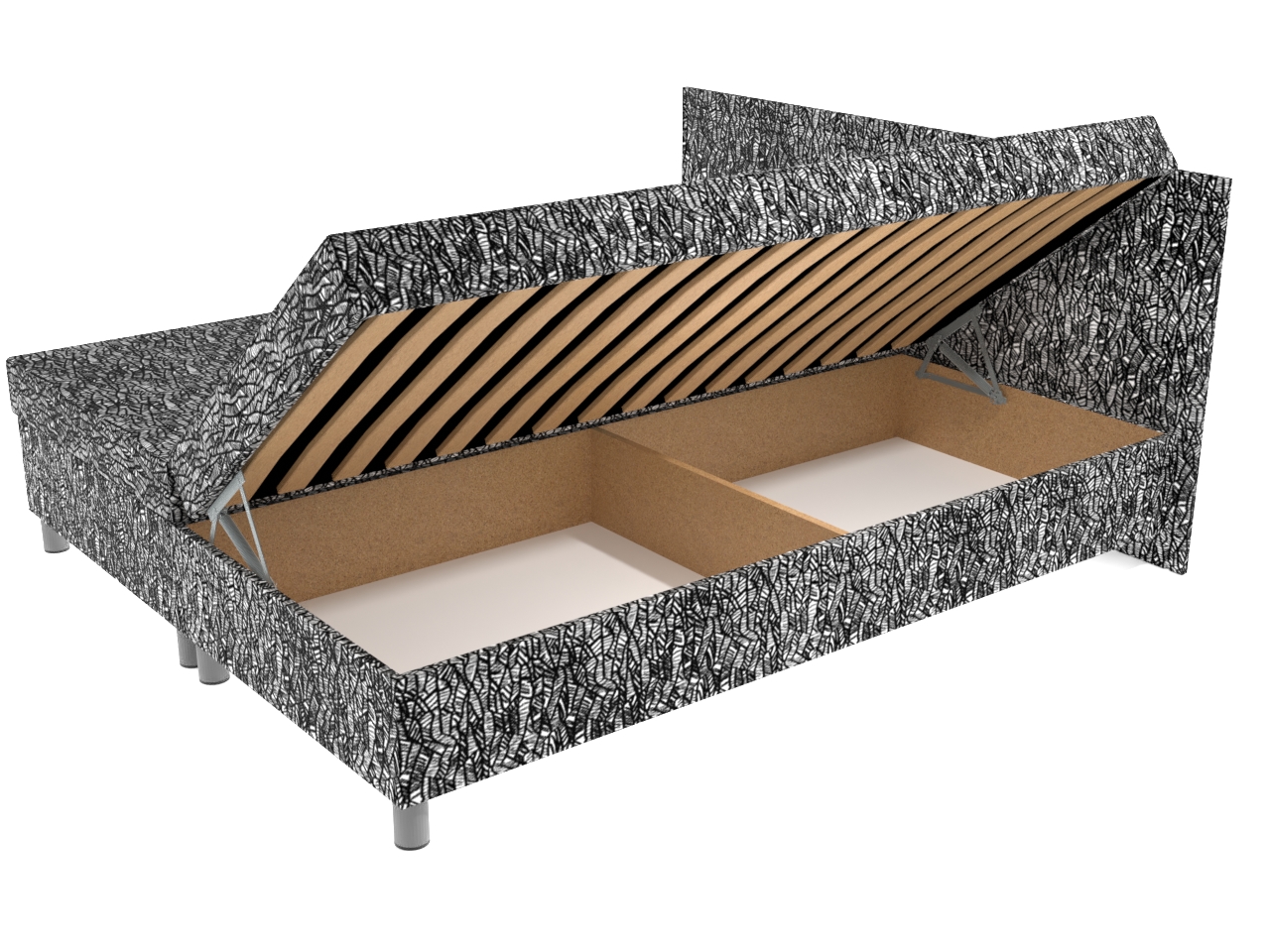 Pohodlná celočalúnená lamelová dvojposteľ na nohách pre Vašu relaxáciu a odpočinok. Dvojposteľ má pevnú konštrukciu z drevotrieskových dosiek. Okrem pohodlného ležania ponúka aj bohatý úložný priestor, otvárajúci sa kvalitným pružinovým mechanizmom, do ktorého umiestnite periny, vankúše a ďalšie veci.