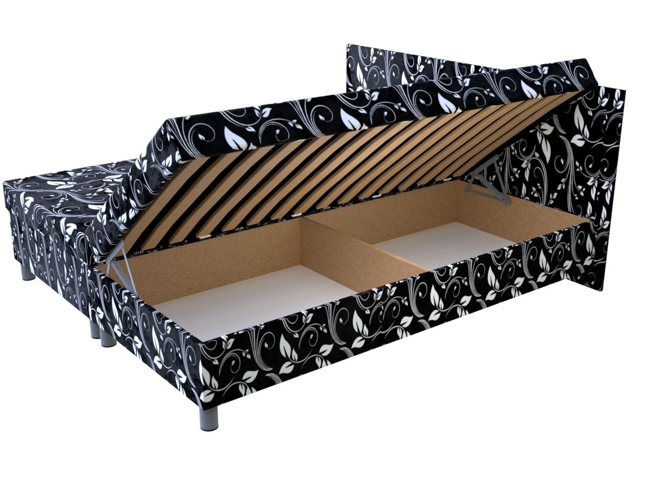 Pohodlná celočalúnená lamelová dvojposteľ na nohách pre Vašu relaxáciu a odpočinok. Dvojposteľ má pevnú konštrukciu z drevotrieskových dosiek. Okrem pohodlného ležania ponúka aj bohatý úložný priestor, otvárajúci sa kvalitným pružinovým mechanizmom, do ktorého umiestnite periny, vankúše a ďalšie veci.