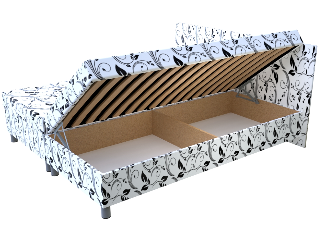 Pohodlná celočalúnená lamelová dvojposteľ na nohách pre Vašu relaxáciu a odpočinok. Dvojposteľ má pevnú konštrukciu z drevotrieskových dosiek. Okrem pohodlného ležania ponúka aj bohatý úložný priestor, otvárajúci sa kvalitným pružinovým mechanizmom, do ktorého umiestnite periny, vankúše a ďalšie veci.