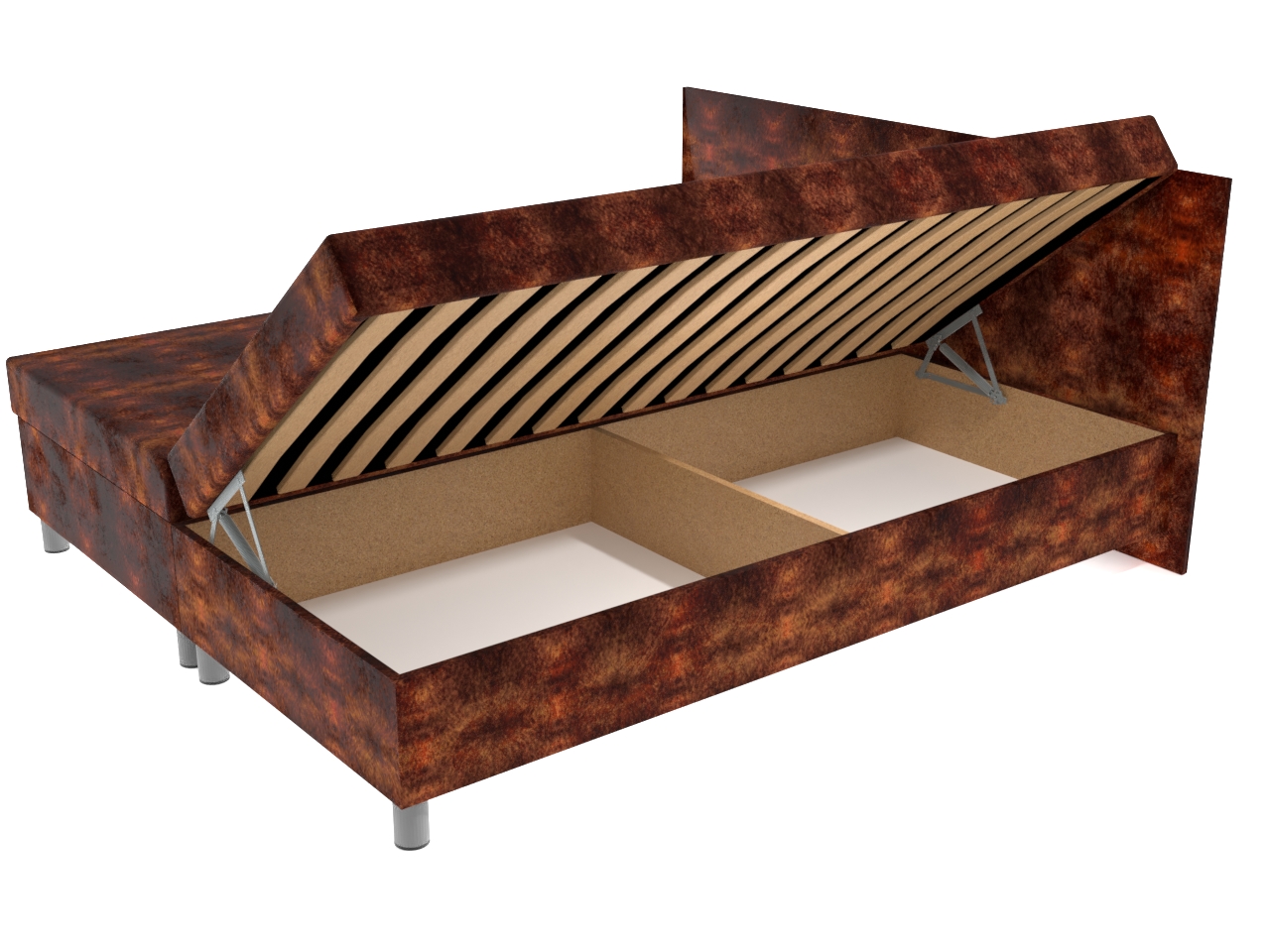 Pohodlná celočalúnená lamelová dvojposteľ na nohách pre Vašu relaxáciu a odpočinok. Dvojposteľ má pevnú konštrukciu z drevotrieskových dosiek. Okrem pohodlného ležania ponúka aj bohatý úložný priestor, otvárajúci sa kvalitným pružinovým mechanizmom, do ktorého umiestnite periny, vankúše a ďalšie veci.