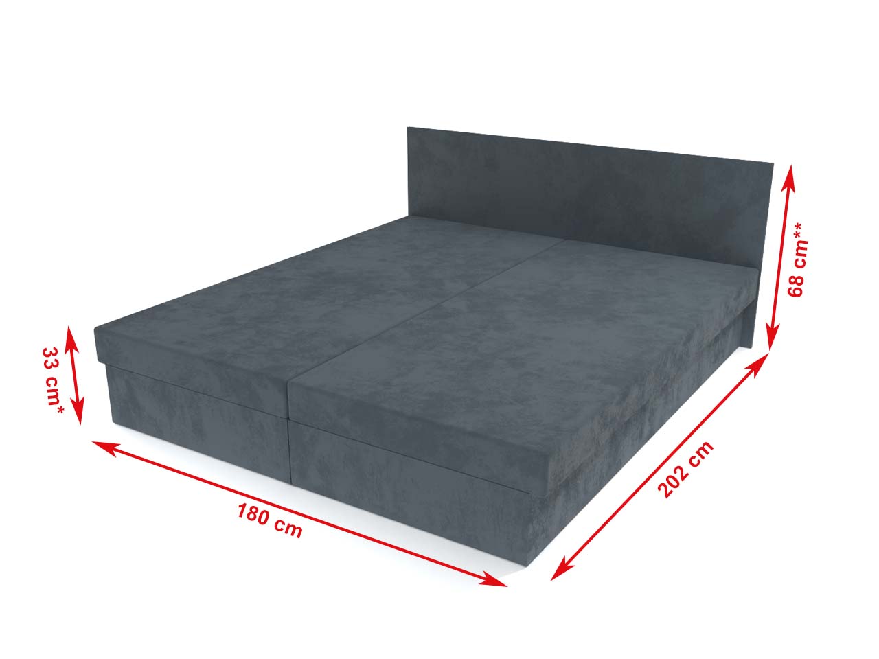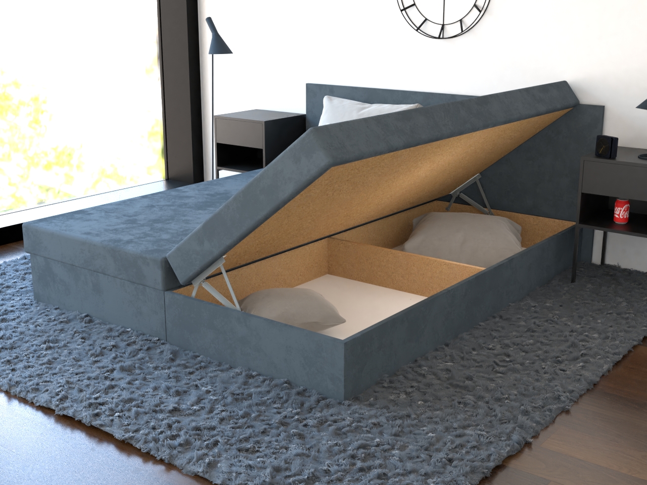 Pohodlná celočalúnená dvojposteľ pre Vašu relaxáciu a odpočinok. Dvojposteľ má pevnú konštrukciu z drevotrieskových dosiek. Okrem pohodlného ležania ponúka aj bohatý úložný priestor, otvárajúci sa kvalitným pružinovým mechanizmom, do ktorého umiestnite periny, vankúše a ďalšie veci.