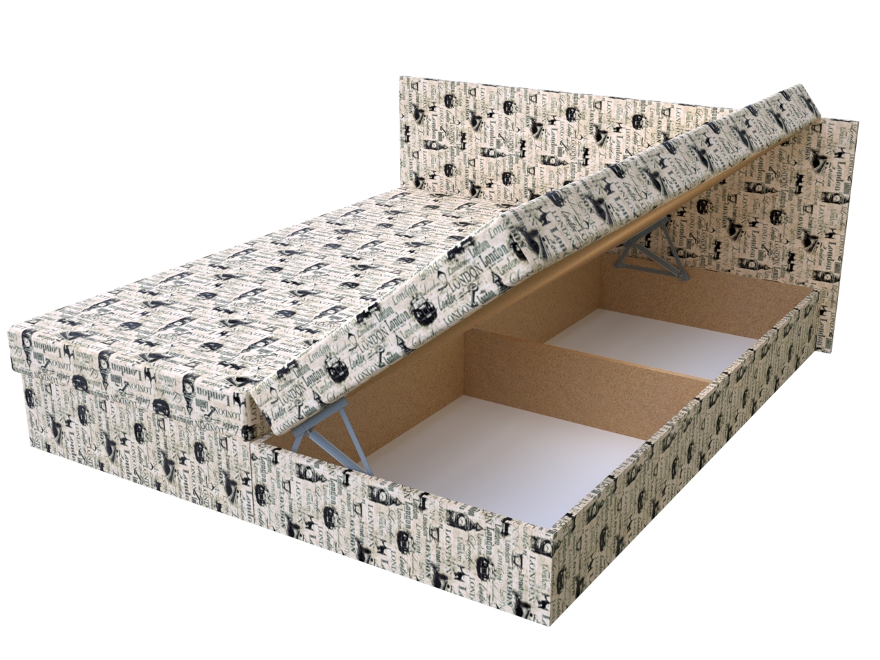 • Dvojposteľ má pevnú konštrukciu z drevotrieskových dosiek a úložný priestor otvárajúci sa kvalitným pružinovým mechanizmom.