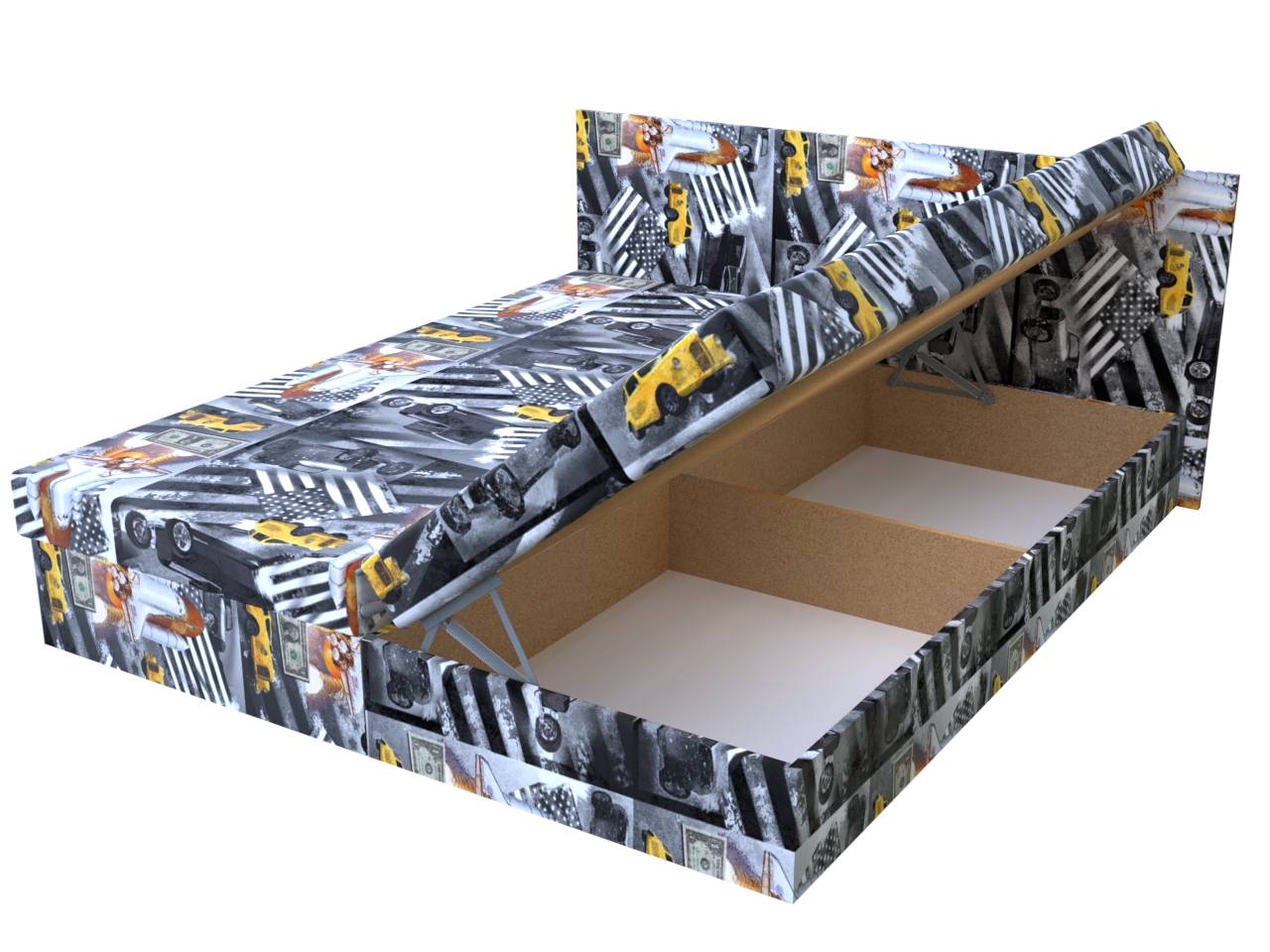 Pohodlná celočalúnená dvojposteľ pre Vašu relaxáciu a odpočinok. Dvojposteľ má pevnú konštrukciu z drevotrieskových dosiek. Okrem pohodlného ležania ponúka aj bohatý úložný priestor, otvárajúci sa kvalitným pružinovým mechanizmom, do ktorého umiestnite periny, vankúše a ďalšie veci.