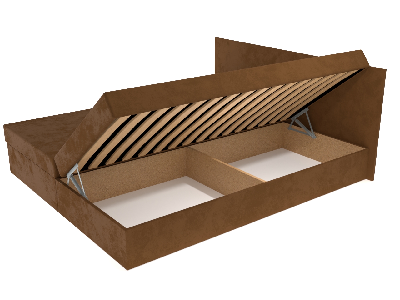 Pohodlná celočalúnená lamelová dvojposteľ pre Vašu relaxáciu a odpočinok. Dvojposteľ má pevnú konštrukciu z drevotrieskových dosiek. Okrem pohodlného ležania ponúka aj bohatý úložný priestor, otvárajúci sa kvalitným pružinovým mechanizmom, do ktorého umiestnite periny, vankúše a ďalšie veci.