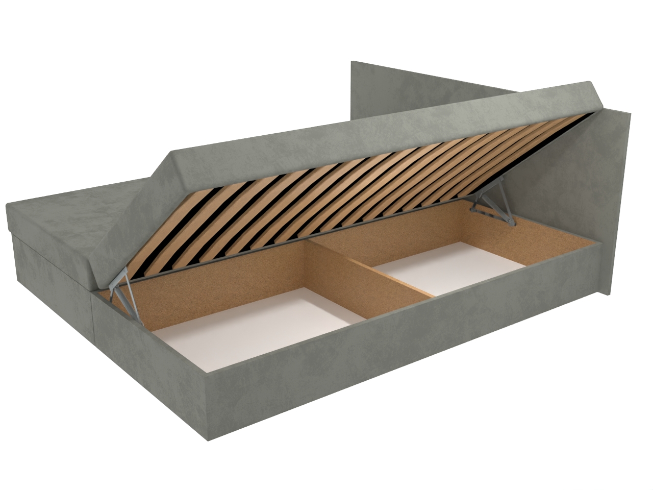 Pohodlná celočalúnená lamelová dvojposteľ pre Vašu relaxáciu a odpočinok. Dvojposteľ má pevnú konštrukciu z drevotrieskových dosiek. Okrem pohodlného ležania ponúka aj bohatý úložný priestor, otvárajúci sa kvalitným pružinovým mechanizmom, do ktorého umiestnite periny, vankúše a ďalšie veci.
