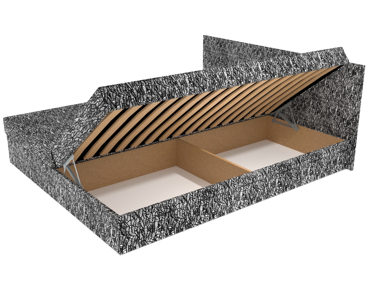 Pohodlná celočalúnená lamelová dvojposteľ pre Vašu relaxáciu a odpočinok. Dvojposteľ má pevnú konštrukciu z drevotrieskových dosiek. Okrem pohodlného ležania ponúka aj bohatý úložný priestor, otvárajúci sa kvalitným pružinovým mechanizmom, do ktorého umiestnite periny, vankúše a ďalšie veci.