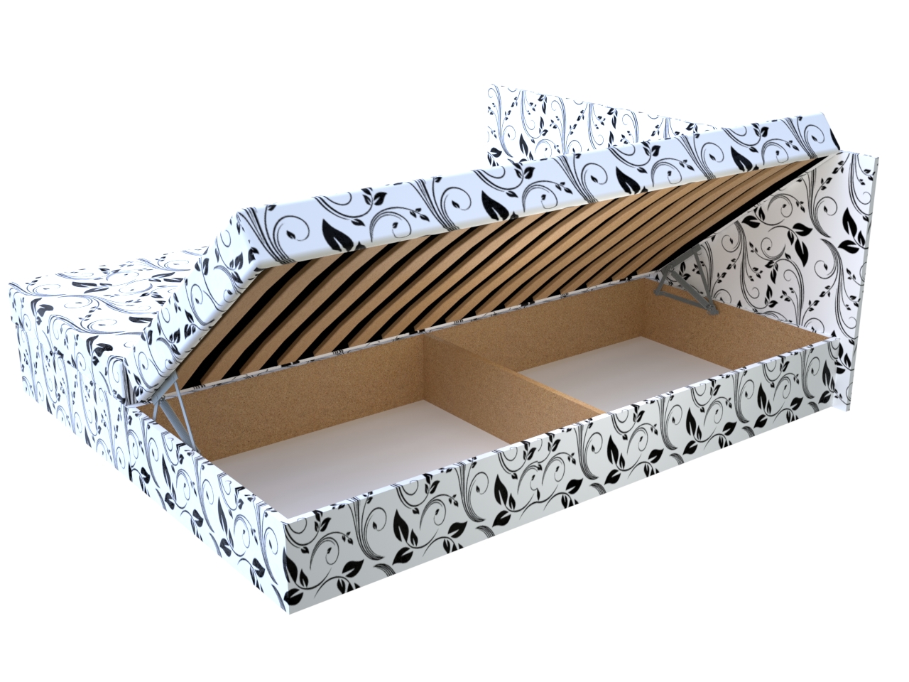 • Dvojposteľ má pevnú konštrukciu z drevotrieskových dosiek a úložný priestor otvárajúci sa kvalitným pružinovým mechanizmom.