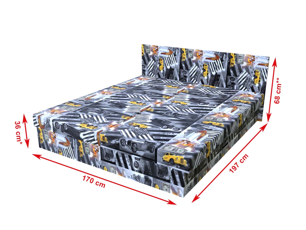**Výška čela sa zmení v prípade prikúpenia zvýšenia úložného priestoru či voľby inej ako základný matrac
