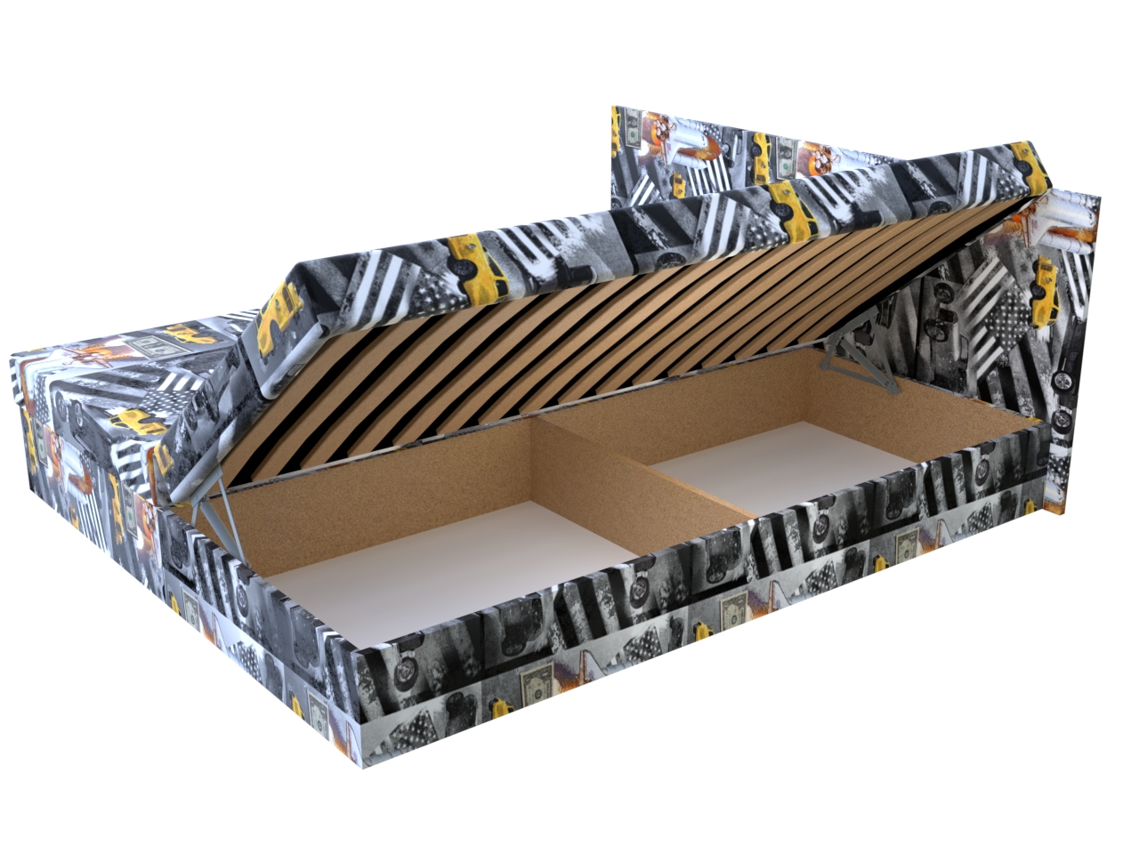 • Dvojposteľ má pevnú konštrukciu z drevotrieskových dosiek a úložný priestor otvárajúci sa kvalitným pružinovým mechanizmom.