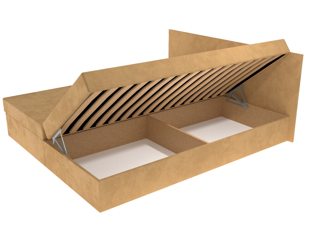 Pohodlná celočalúnená lamelová dvojposteľ pre Vašu relaxáciu a oddych. Dvojposteľ má pevnú konštrukciu z drevotrieskových dosiek. Okrem pohodlného ležania ponúka aj bohatý úložný priestor, otvárajúci sa kvalitným pružinovým mechanizmom, do ktorého umiestnite periny, vankúše a ďalšie veci.