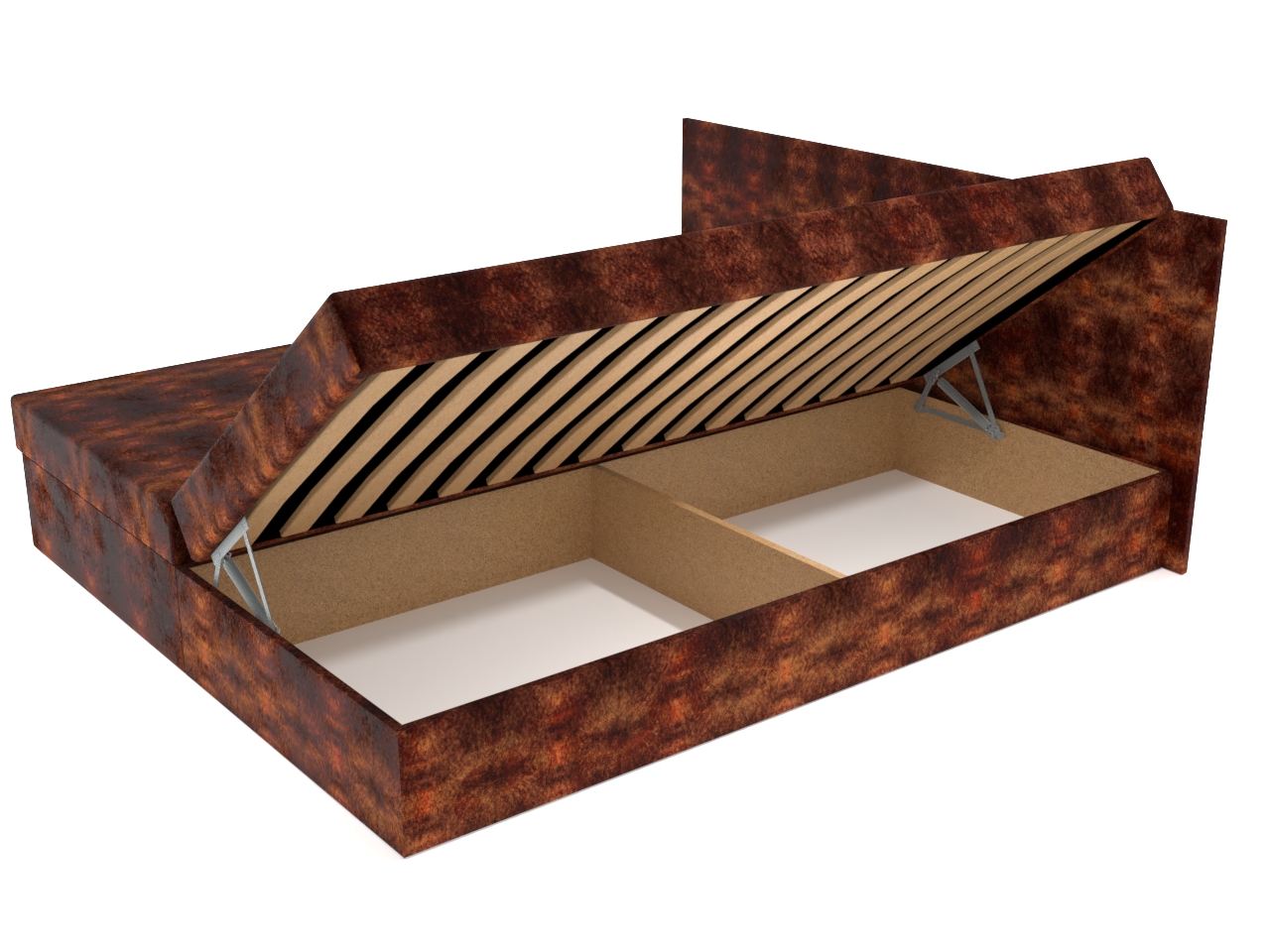 • Dvojposteľ má pevnú konštrukciu z drevotrieskových dosiek a úložný priestor otvárajúci sa kvalitným pružinovým mechanizmom.