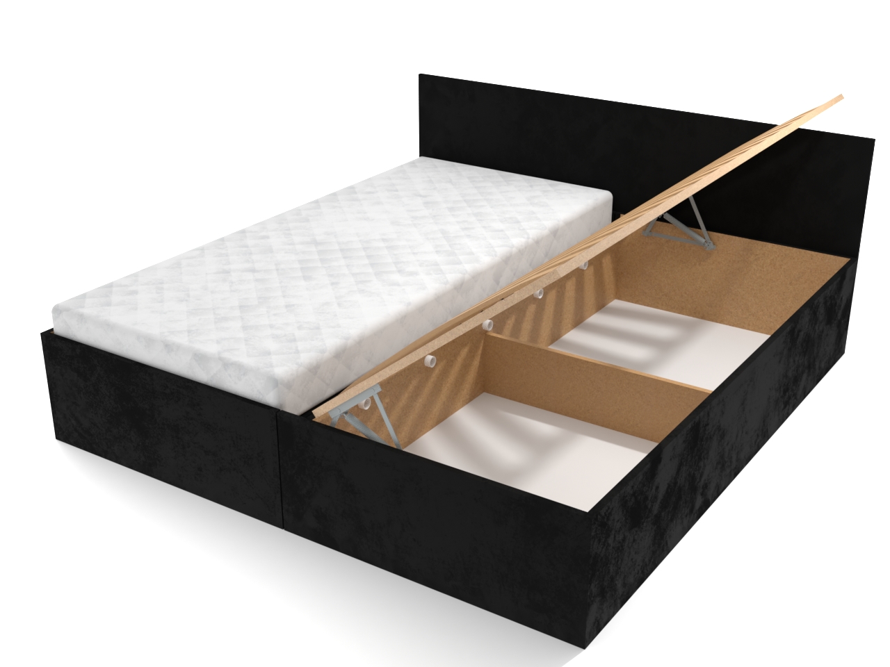 Pohodlná celočalúnená dvojposteľ pre Vašu relaxáciu a odpočinok. Dvojposteľ má pevnú konštrukciu z drevotrieskových dosiek. Posteľ je vybavená kvalitným lamelovým roštom, ktorého otvorením získate prístup k priestrannému úložnému priestoru, ktorý je vhodný na uloženie perín, vankúšov a ďalších vecí.