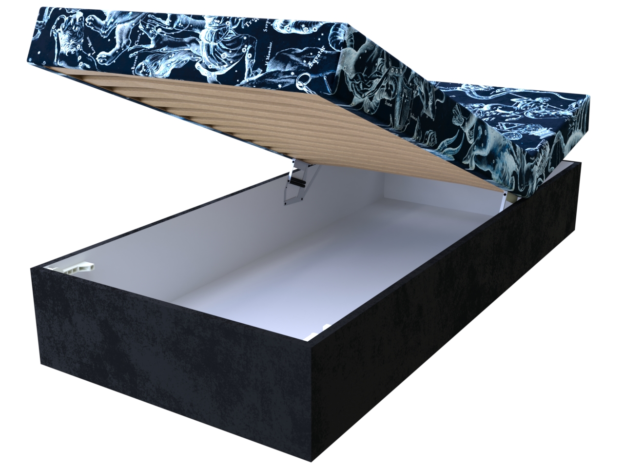 • Posteľ je vybavená kvalitným pružinovým mechanizmom, ktorý je možné polohovať pod hlavou a zároveň sa otvára od nôh pre prístup do úložného priestoru.