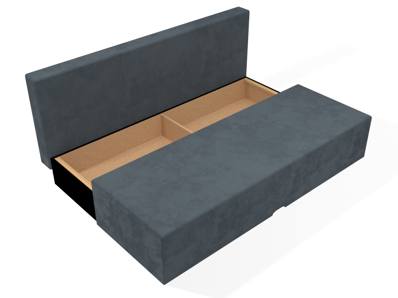 Rozkladacia celočalúnená pohovka Katarina na každodenné spanie s úložným priestorom zo surovej drevotrieskovej dosky a molitanovým matracom.