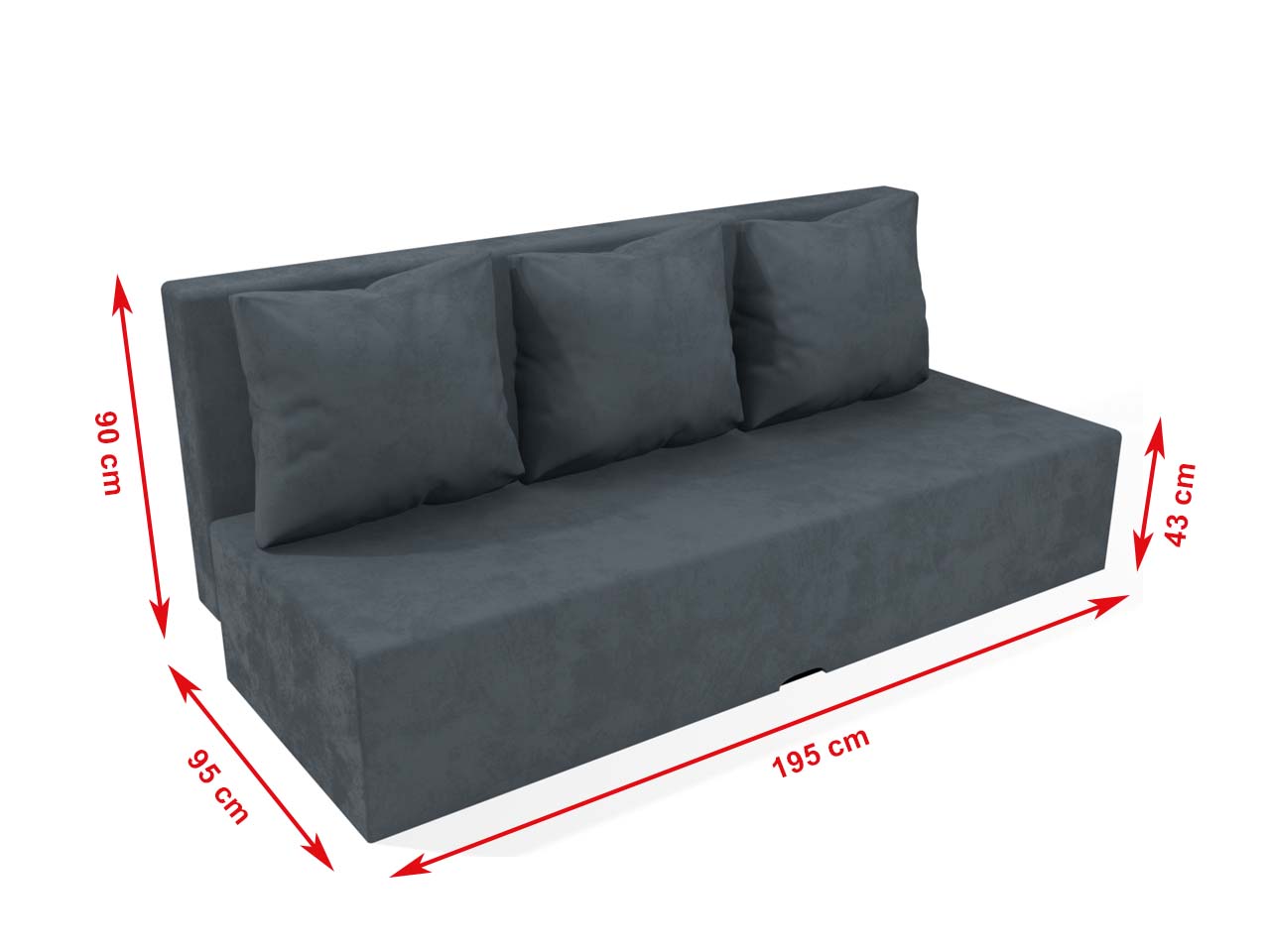 Rozkladacia celočalúnená pohovka Karin na každodenné spanie s úložným priestorom zo surovej drevotrieskovej dosky a pružinovým matracom.