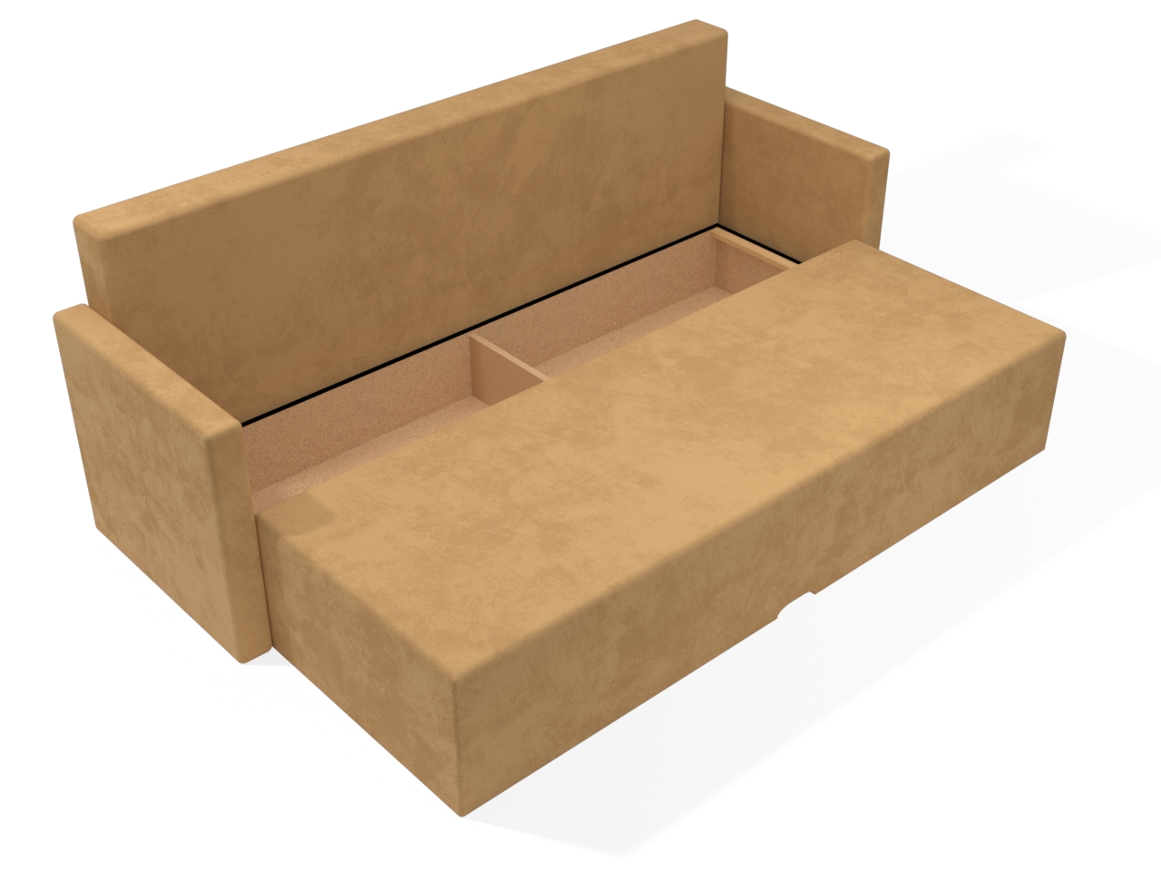 • Rozkladacia celočalúnená pohovka s podrúčkami na každodenné spanie s úložným priestorom zo surovej drevotrieskovej dosky a s molitanovým či pružinovým matracom.