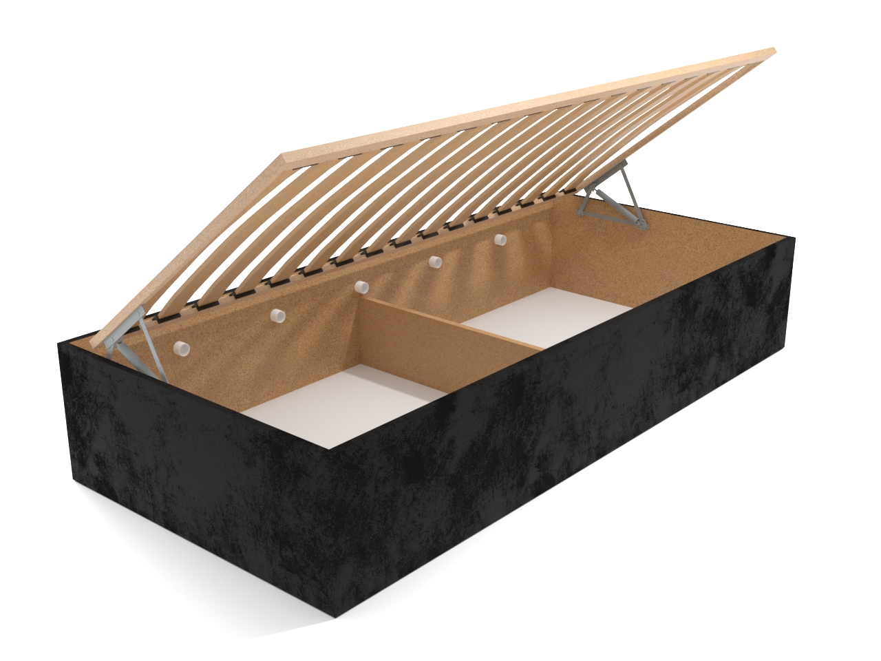 • Posteľ je vybavená kvalitným výklopným lamelovým roštom, ktorého otvorením získate prístup k priestrannému úložnému priestoru vhodnému na uloženie perín, vankúšov a ďalších vecí