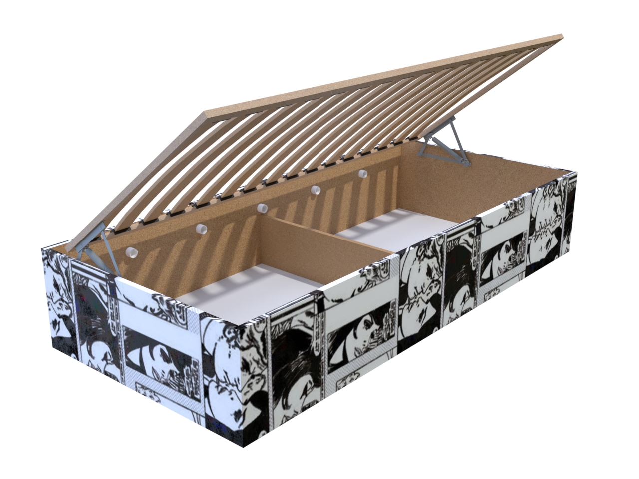 • Posteľ je vybavená kvalitným výklopným lamelovým roštom, ktorého otvorením získate prístup k priestrannému úložnému priestoru vhodnému na uloženie perín, vankúšov a ďalších vecí