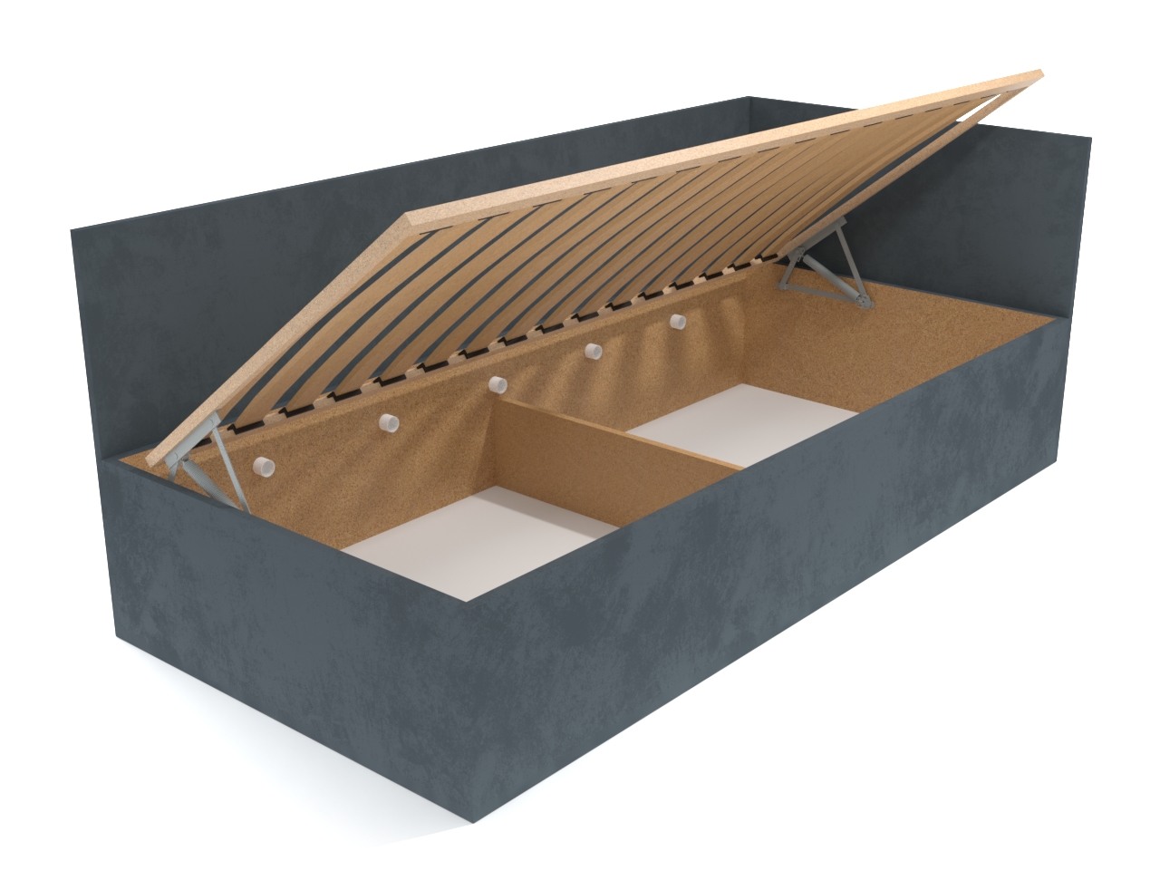 Pohodlná celočalúnená posteľ s veľkým a malým čelom pre Vašu relaxáciu a oddych. Posteľ má pevnú konštrukciu z drevotrieskových dosiek. Posteľ je vybavená kvalitným lamelovým roštom, ktorého otvorením získate prístup k priestrannému úložnému priestoru, ktorý je vhodný na uloženie perín, vankúšov a ďalších vecí.
