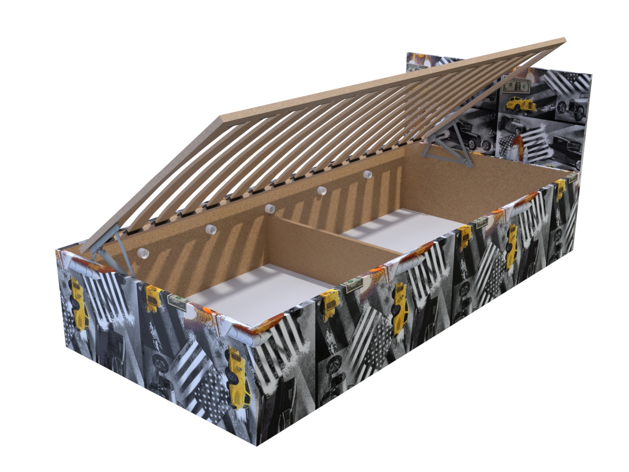 • Posteľ je vybavená kvalitným výklopným lamelovým roštom, ktorého otvorením získate prístup k priestrannému úložnému priestoru vhodnému na uloženie perín, vankúšov a ďalších vecí