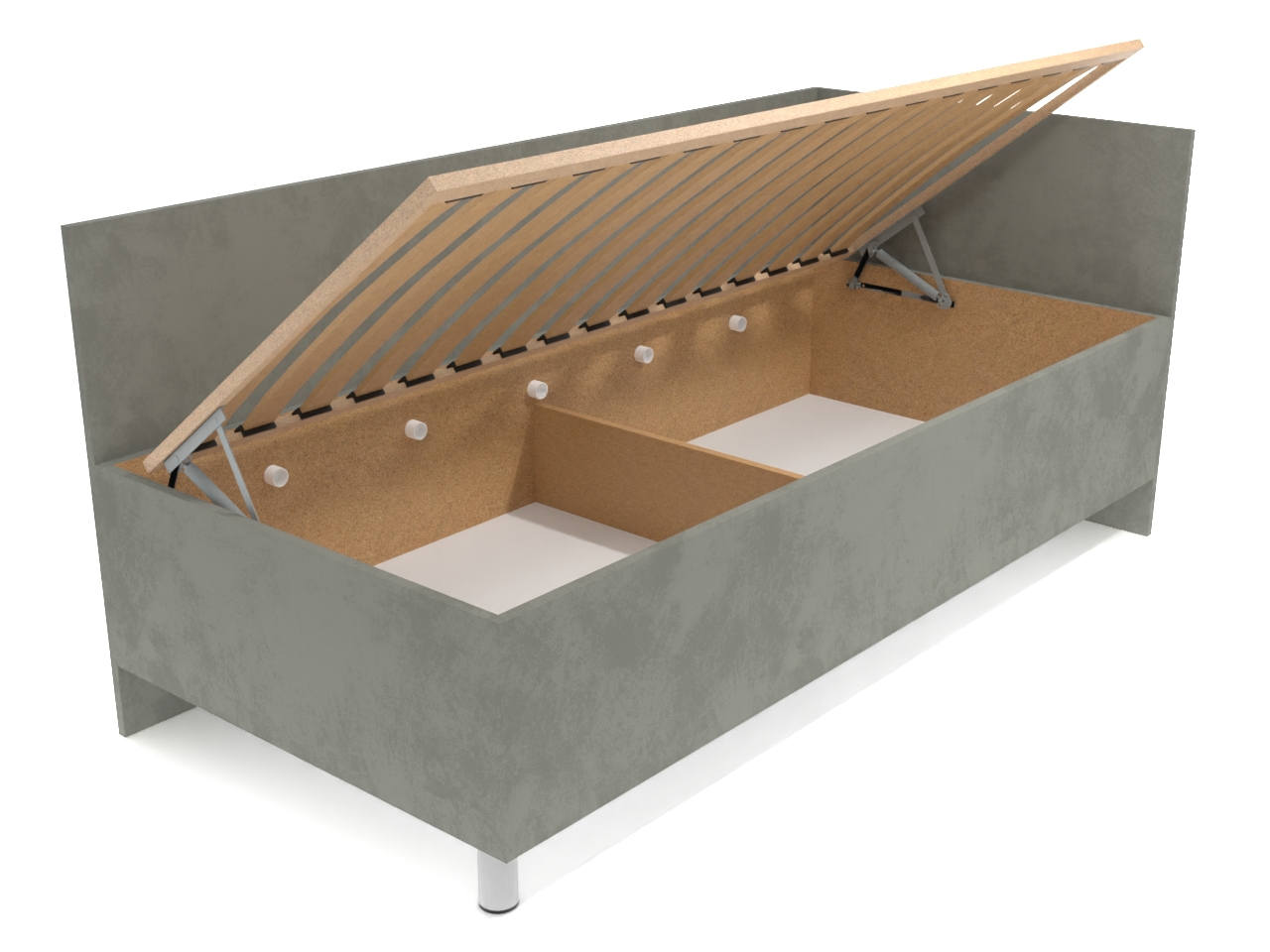 Pohodlná celočalúnená posteľ s veľkým a malým čelom pre Vašu relaxáciu a oddych. Posteľ má pevnú konštrukciu z drevotrieskových dosiek. Posteľ je vybavená kvalitným lamelovým roštom, ktorého otvorením získate prístup k priestrannému úložnému priestoru, ktorý je vhodný na uloženie perín, vankúšov a ďalších vecí.