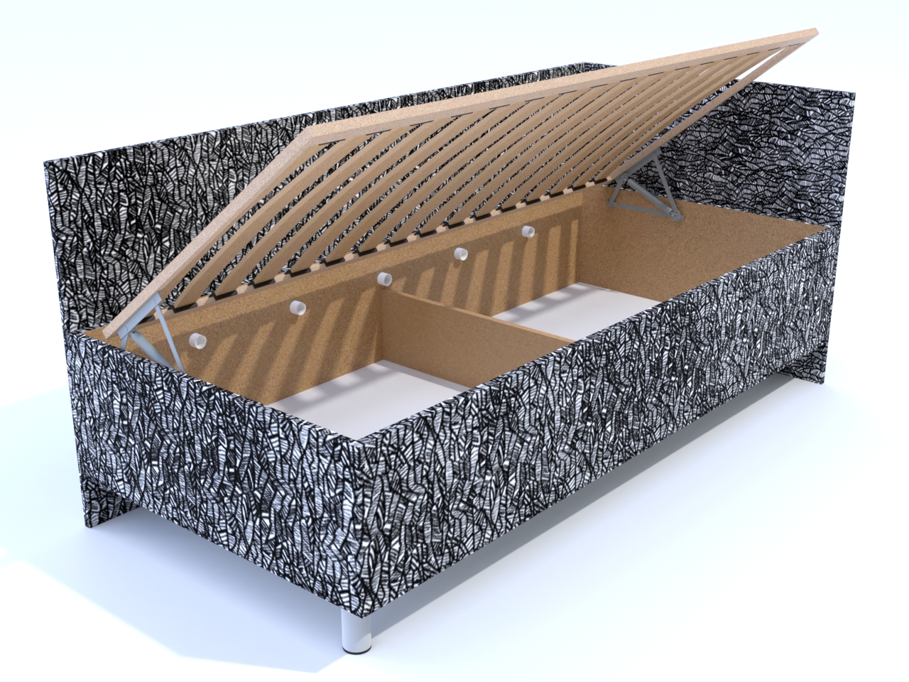 • Posteľ je vybavená kvalitným výklopným lamelovým roštom, ktorého otvorením získate prístup k priestrannému úložnému priestoru vhodnému na uloženie perín, vankúšov a ďalších vecí