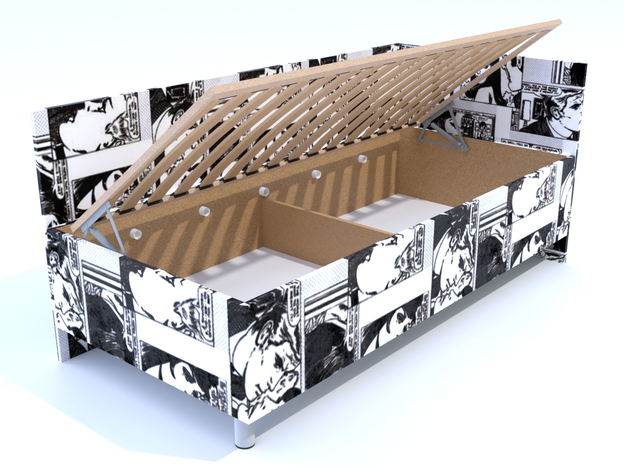 • Posteľ je vybavená kvalitným výklopným lamelovým roštom, ktorého otvorením získate prístup k priestrannému úložnému priestoru vhodnému na uloženie perín, vankúšov a ďalších vecí