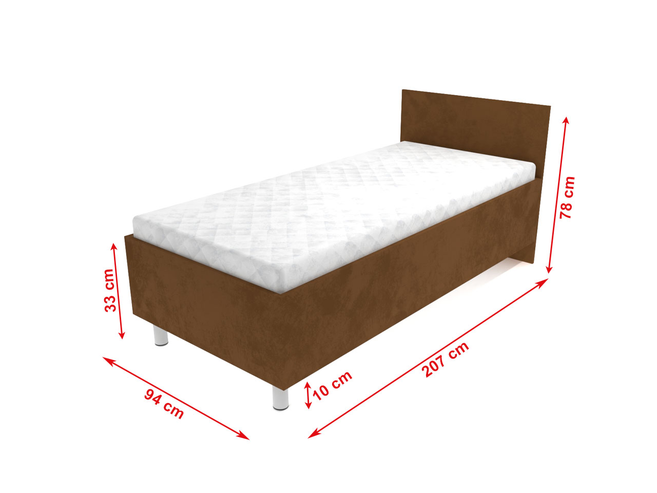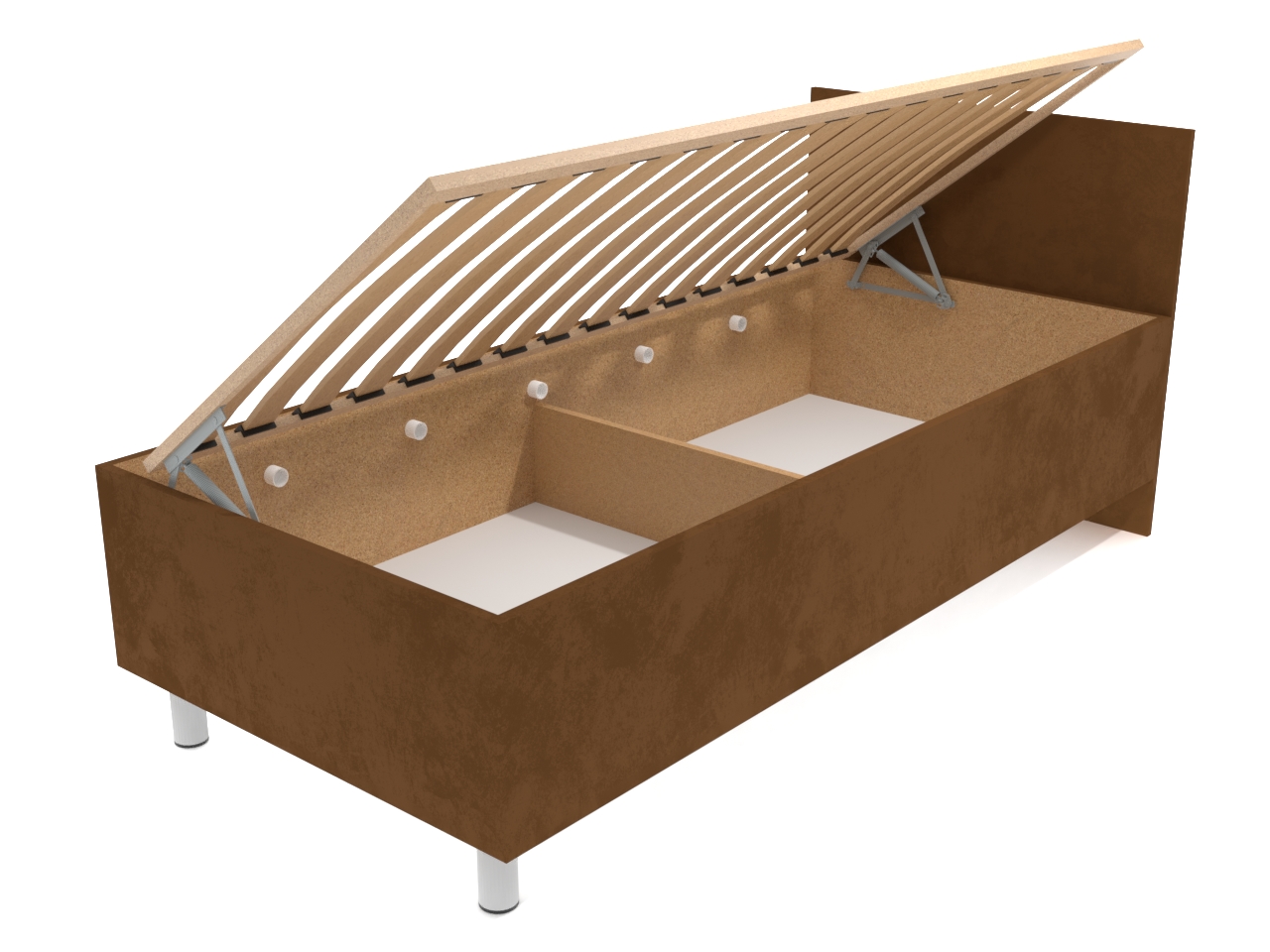 Pohodlná celočalúnená posteľ s malým čelom pre Vašu relaxáciu a oddych. Posteľ má pevnú konštrukciu z drevotrieskových dosiek. Posteľ je vybavená kvalitným lamelovým roštom, ktorého otvorením získate prístup k priestrannému úložnému priestoru, ktorý je vhodný na uloženie perín, vankúšov a ďalších vecí.
