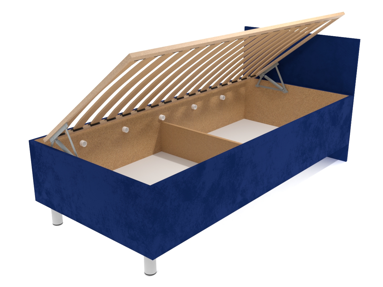 Pohodlná celočalúnená posteľ s malým čelom pre Vašu relaxáciu a oddych. Posteľ má pevnú konštrukciu z drevotrieskových dosiek. Posteľ je vybavená kvalitným lamelovým roštom, ktorého otvorením získate prístup k priestrannému úložnému priestoru, ktorý je vhodný na uloženie perín, vankúšov a ďalších vecí.
